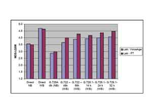 圖2對(duì)MOS(平均意見得分)值的分析深刻說明了寬帶是如何被主觀感知的。窄帶G.729A的多數(shù)MOS值約為 3.5,而高清語音的MOS值至少比其高出30%,達(dá)到4.5。
