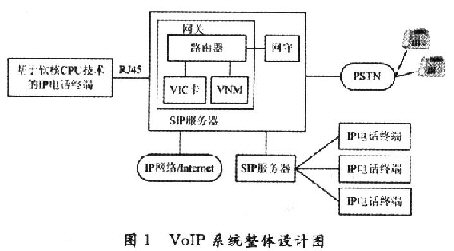 通過對(duì)國(guó)內(nèi)外VoIP技術(shù)的研究,要面向社會(huì)推廣價(jià)格低廉的IP電話業(yè)務(wù),普通用戶的電話終端成本,運(yùn)營(yíng)商的設(shè)備、管理成本都是必須考慮的因素。因此,設(shè)計(jì)出了一個(gè)VoIP系統(tǒng)方案,如圖1所示。