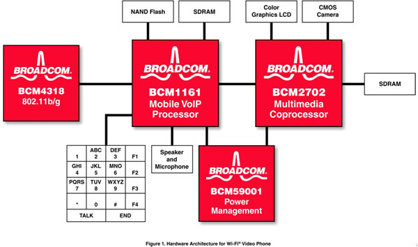 該方法的一個例子如圖1所示。該方案支持接入到本地無線網(wǎng)絡的Wi-Fi 接口上的全雙工語音和視頻,它已經(jīng)有了成功的實現(xiàn)案例,并計劃用于一款新型的消費產(chǎn)品設計。所有高級的呼叫建立和管理、音視頻同步以及應用層都在一片BCM1161 VoIP器件上運行。為實現(xiàn)這些功能采用了一片嵌入式通用ARM926E RISC CPU,還有一片嵌入式DSP用于音視頻編解碼和回波消除。利用一個BCM4318E 802.11b/g Wi-Fi無線網(wǎng)絡接口,BCM1161提供了為實現(xiàn)一個具有成本效益的Wi-Fi手機的語音所需的全部功能。