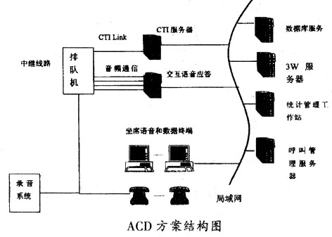 ____這種方案的核心思想是在專用交換機(jī)+ACD的基礎(chǔ)上擴(kuò)展路由和統(tǒng)計(jì)的功能,開放CTI -Link接口,用CTI技術(shù)實(shí)現(xiàn)通信和計(jì)算機(jī)的功能結(jié)合,再配以必要的語音和數(shù)據(jù)庫系統(tǒng),從 而以強(qiáng)大的通信和計(jì)算機(jī)功能滿足呼叫中心的要求。