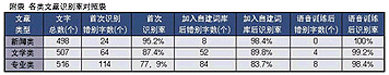 然后,我們又利用聲龍?zhí)赜械脑~匯生成器,讓聲龍自行辨別文章中的詞匯并自動添加到自建詞庫中,并針對其中的一些英文單詞或縮寫對聲龍進(jìn)行語音識別訓(xùn)練,之后我們再次錄入同一篇專業(yè)文章。結(jié)果非常令人滿意,從附表可以看出識別率有了明顯提高。最后,我們又錄入了另一篇相同領(lǐng)域的專業(yè)文章中的一段(512字)。首次錄入的錯(cuò)別字有46個(gè),識別正確率為91%。與第一篇文章相比,識別率有了明顯提高。