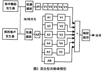 ----混 合 型 共 振 峰 模 型 在 級(jí) 聯(lián) 型 共 振 峰 合 成 模 型 中, 共 振 峰 濾 波 器 首 尾 相 接; 而 在 并 聯(lián) 型 模 型 中, 輸 入 信 號(hào) 先 分 別 通 過 幅 度 調(diào) 節(jié) 再 加 到 每 一 個(gè) 共 振 峰 濾 波 器 上, 然 后 將 各 路 的 輸 出 疊 加 起 來(lái)。 將 兩 者 比 較, 對(duì) 于 合 成 聲 源 位 于 聲 道 末 端 的 語(yǔ) 音( 大 多 數(shù) 的 元 音), 級(jí) 聯(lián) 型 合 乎 語(yǔ) 音 產(chǎn) 生 的 聲 學(xué) 理 論, 并 且 無(wú) 需 為 每 一 個(gè) 濾 波 器 分 設(shè) 幅 度 調(diào) 節(jié); 而 對(duì) 于 合 成 聲 源 位 于 聲 道 中 間 的 語(yǔ) 音( 大 多 數(shù) 清 擦 音 和 塞 音), 并 聯(lián) 型 則 比 較 合 適, 但 是 其 幅 度 調(diào) 節(jié) 很 復(fù) 雜。 基 于 此 種 考 慮, 人 們 將 兩 者 結(jié) 合 在 一 起, 提 出 了 混 和 型 共 振 峰 模 型, 如 圖2 所 示。