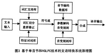 ----一 種 典 型 的 基 于 單 音 節(jié) 和VQLPC( 矢 量 量 化 的LPC) 技 術(shù) 的 文 語(yǔ) 轉(zhuǎn) 換 系 統(tǒng) 原 理 圖 如 圖3 所 示。