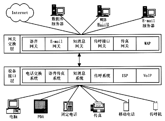 統(tǒng)一消息平臺集成了固定電話網(wǎng)、移動(dòng)電話網(wǎng)和Internet網(wǎng)絡(luò)。目前,電話網(wǎng)和Internet網(wǎng)各自擁有獨(dú)立的網(wǎng)絡(luò)資源和信息服務(wù)領(lǐng)域,而這兩大網(wǎng)絡(luò)的用戶群存在著很大的交叉。電話的使用在中國已經(jīng)占有很高的普及率,傳統(tǒng)的160/168聲訊服務(wù)已經(jīng)成為中國百姓所熟悉的最具代表性的電話信息服務(wù),而Internet作為在中國剛剛興起的信息媒體,尚需要普通百姓逐漸認(rèn)識它、使用它。統(tǒng)一消息平臺將電話網(wǎng)和Internet網(wǎng)結(jié)合在一起,極大地?cái)U(kuò)大了兩大網(wǎng)絡(luò)各自的用戶群,電話用戶可以用電話或者傳真獲取Internet上的信息,電子郵件服務(wù)也可以不局限于Internet,而能對廣大的電話用戶開放。統(tǒng)一消息平臺為用戶帶來的是信息的方便、及時(shí),使人們在任何時(shí)間、任何地點(diǎn)都能夠獲取需要的信息。