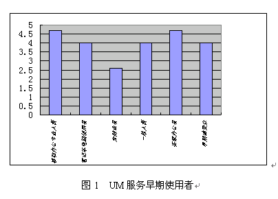 該調(diào)查還發(fā)現(xiàn),UM早期使用者將是在家辦公者,移動(dòng)辦公專業(yè)人群、早期受眾、筆記本電腦使用者、一般人群、從事金融工作的人群,他們的使用傾向度如圖1所示,值越高表示越愿意使用。