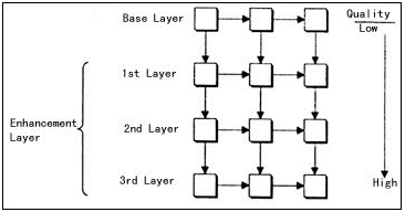 關(guān)于分層可擴(kuò)展性編碼的研究可以追溯到10年前,目前它已經(jīng)被許多現(xiàn)行的國(guó)際壓縮標(biāo)準(zhǔn)接納,例如H.263+和MPEG-4。分層可擴(kuò)展編碼主要有三種:時(shí)域可擴(kuò)展性、空域可擴(kuò)展性和質(zhì)量可擴(kuò)展性。其中質(zhì)量可擴(kuò)展性也稱為PSNR可擴(kuò)展性,原因是視頻質(zhì)量通常用峰值信噪比(PSNR)來衡量。