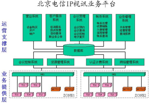 在整個(gè)運(yùn)營支撐層的系統(tǒng)中,主要包括四大系統(tǒng),即會(huì)議控制系統(tǒng)、資源管理系統(tǒng)、認(rèn)證計(jì)費(fèi)系統(tǒng)、網(wǎng)絡(luò)管理系統(tǒng)。除此之外,還有其它幾個(gè)輔助系統(tǒng),包括營業(yè)系統(tǒng)負(fù)責(zé)為客戶開戶和銷戶,終端注冊(cè)等處理;客戶服務(wù)系統(tǒng)提供咨詢服務(wù)、投訴受理、自動(dòng)查詢和幫助客戶進(jìn)行會(huì)議預(yù)約,在資源不足的情況下進(jìn)行會(huì)議調(diào)度等;會(huì)議受理系統(tǒng)是面向客戶提供會(huì)議電視業(yè)務(wù)預(yù)約、會(huì)議狀態(tài)查詢、會(huì)議控制服務(wù),由用戶自助完成預(yù)約會(huì)議和控制會(huì)議的操作;賬務(wù)系統(tǒng)負(fù)責(zé)賬務(wù)方面的管理,包括賬務(wù)管理,收費(fèi)銷賬,催繳欠費(fèi)、銀行繳費(fèi)等;業(yè)務(wù)管理系統(tǒng)主要是記賬卡的卡務(wù)處理、經(jīng)營管理、查詢報(bào)表等。