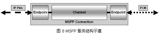 MSPP運行在FusionTM環(huán)境下,意即Media Stream Processing Protocol,媒體流處理協(xié)議,它為各種業(yè)務(wù)間的數(shù)據(jù)轉(zhuǎn)換/交互提供了一種可能。它相當(dāng)于一個中間代理(Agent),通過標準的入口/出口終結(jié)點(Entry and Exit Endpoint)和端到端連接(End-End Connection)完成異種網(wǎng)絡(luò)間的格式化數(shù)據(jù)(Formatted Data)傳遞功能,見圖8。MSPP包含兩個基本組件:終結(jié)點(Endpoint)和通道(Channel),異種網(wǎng)絡(luò)間通過這兩種組件構(gòu)成的連接(Connection)完成。