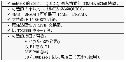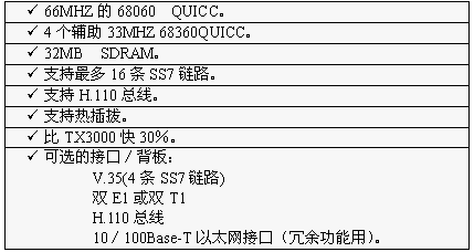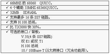 TX3000卡的功能大致和TX2000卡相同,但它比TX2000的性能2.5至5倍。TX3000卡上有一個66MHZ的68060協(xié)處理器。TX3000卡為SS7應(yīng)用配置1至4個QUICC通信控制器,最多16條信令鏈路,提供一個三口V.35,擁有雙T1或雙E1接口。(主板上標(biāo)準配置一個QUICC,支持四條SS7鏈路,當(dāng)CT總線和串行接口都要使用,或者處理的鏈路超過4條時,可先配置有三個QUICC的背板,四個QUICC可支持16條SS7鏈路)。