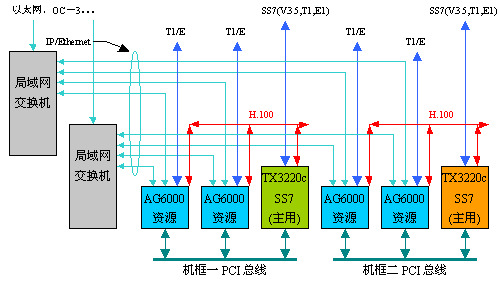 結(jié)構(gòu)圖中表示有兩臺(tái)機(jī)器,每臺(tái)機(jī)器都插有兩塊AG6000資源卡和一塊TX3220c卡。一臺(tái)機(jī)器是主用的,而另一臺(tái)是冗余備份的。AG6000完成媒體網(wǎng)關(guān)的功能,TX3220c完成信令網(wǎng)關(guān)的功能,媒體網(wǎng)關(guān)控制器是軟件實(shí)現(xiàn)的,沒有對應(yīng)的硬件。