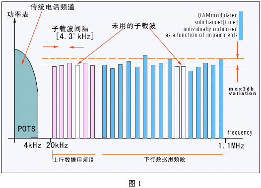 DSL技術是在人們對高速互聯(lián)網訪問需求推動下的產物。DSL利用頻率復用和OFDM調制技術,在不影響傳統(tǒng)電話業(yè)務的前提下可以為用戶提供最高達8Mbps的數(shù)據(jù)傳輸速率。這個速率是基于POTS的Modem速率(以目前的最高速率56kbps為參考)的140倍;DSL技術所帶來的巨大帶寬為家庭和小型公司提供了一個寬帶數(shù)字業(yè)務的新平臺。這個DSL平臺可以支持多種寬帶業(yè)務:包括高速Internet接入、虛擬專網及VOD等流媒體業(yè)務。其基本原理如下圖1所示:
