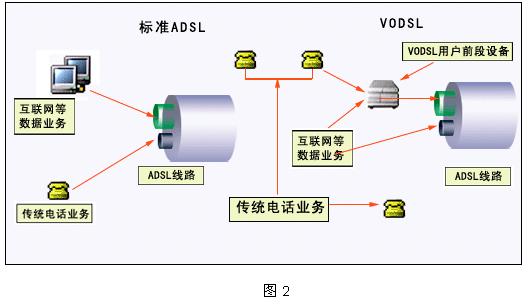 VoDSL技術,就是利用xDSL技術在一對傳統(tǒng)電話用戶線上,維持原有電話業(yè)務的同時,提供高速數(shù)據(jù)業(yè)務(如互聯(lián)網業(yè)務)和多個額外電話業(yè)務。利用VoDSL技術,業(yè)務提供商在無需增添新的數(shù)據(jù)網絡或硬件線路就可以為用戶提供高速的數(shù)據(jù)接入和更多的電話線路數(shù)及其他增值業(yè)務,從而減少運營成本,擴大了利潤空間。下圖2的左邊給出了電話運營商采用ADSL技術的基本配置,右邊則給出了VoDSL應用。