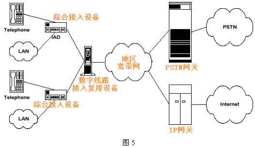 這種方式又稱為VoMBN/VoMSBN(Voice over Multi-service Broadband Network)。圖5給出了MSDN的邏輯結(jié)構(gòu)這種方式下,DSL本地環(huán)路和PSTN及Internet間的互聯(lián)不再通過Class 5交換機,而由地區(qū)寬帶多業(yè)務網(wǎng)絡代替,從用戶側(cè)看仍和Class 5 交換機等效,當其功能復雜得多。這個網(wǎng)絡可以是基于IP或ATM的,它包含信令系統(tǒng)和呼叫處理服務器及各種網(wǎng)關(guān)設備。