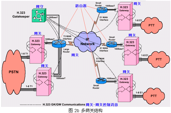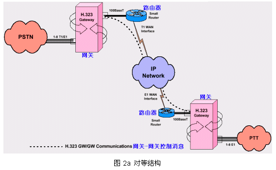 從PSTN來的呼叫被H.323網(wǎng)關(guān)受理,把其中的話音流轉(zhuǎn)換成IP數(shù)據(jù)包經(jīng)過IP網(wǎng)絡(luò)傳到目的網(wǎng)關(guān)下的指定電話終端;同時受理IP網(wǎng)絡(luò)來的呼叫(可以來自電腦終端或另一個PTT網(wǎng)絡(luò))轉(zhuǎn)向PSTN目的終端1。