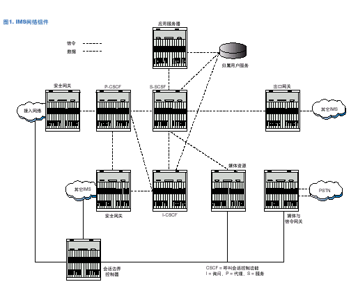 為獲得上述優(yōu)勢,IMS主要使用了如下組件:歸屬用戶服務(wù)、呼叫會話控制功能、安全網(wǎng)關(guān)、IP媒體服務(wù)器、及應(yīng)用服務(wù)器。圖1是這些組件及其它IMS網(wǎng)絡(luò)組件的圖解。
