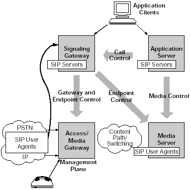 許多語音服務都是由媒體服務器提供的。例如,一個客戶給某個電子商務網(wǎng)站打電話會被接到一個自動語音應答(IVR)上或者自動總機上。這些應用使用了語音,語音識別和音頻等功能,都是運行在媒體服務器上的。在下一代網(wǎng)絡的實現(xiàn)中,媒體服務器就象是另一個電話(或者說,一個SIP的終端)。因此,他們可以享受和用戶一樣的SIP的優(yōu)點。