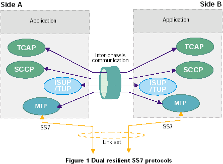 一個(gè)雙ISUP/TUP系統(tǒng)通過(guò)激活每個(gè)機(jī)箱中的一半電路協(xié)議狀態(tài)機(jī)進(jìn)行工作。每個(gè)ISUP/TUP層通過(guò)本地MTP3發(fā)送所有的傳送業(yè)務(wù)。本地MTP3采用與相鄰SS7節(jié)點(diǎn)之間的本地鏈路進(jìn)行傳輸,如果該鏈路發(fā)生故障,采用機(jī)箱之間的SS7連接。