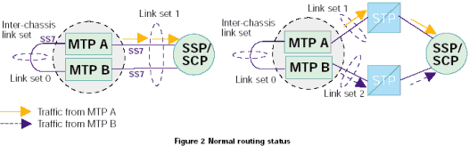 上面所列的前3個(gè)方案可以通過(guò)在兩個(gè)相鄰的節(jié)點(diǎn)之間采用多條鏈路(64或56Kbps)來(lái)實(shí)現(xiàn),最后兩個(gè)方案可以通過(guò)在兩個(gè)機(jī)箱內(nèi)采用兩個(gè)獨(dú)立但互相協(xié)作的SS7協(xié)議棧來(lái)完成。這兩個(gè)機(jī)箱在正常情況下是分開(kāi)的,但可以通過(guò)互連來(lái)提供更高的抵抗故障的能力。