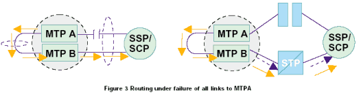 當(dāng)連接到MTP A或連接到 MTP B的鏈路發(fā)生故障時(shí),消息發(fā)送通過(guò)MTP A和MTP B之間的鏈路發(fā)送到另一個(gè)MTP,并在可用的鏈路上發(fā)送,如圖3。