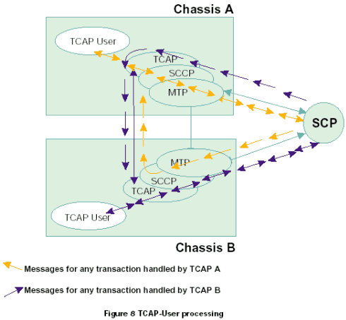 每個(gè)TCAP將所有接收的信息傳遞到同機(jī)箱中的TCAP用戶(hù)任務(wù)中,根據(jù)每一個(gè)TCAP中不同的應(yīng)用層或用戶(hù),將TCAP層的應(yīng)用程序發(fā)送的傳送會(huì)話(huà)和組件原語(yǔ)傳遞給正確的TCAP。在一個(gè)雙系統(tǒng)環(huán)境中,接收的消息可以在任何MTP和SCCP層上共享。因此,一個(gè)TCAP層接收由其他TCAP處理的應(yīng)用在激活事務(wù)上的TCAP消息是可能的。